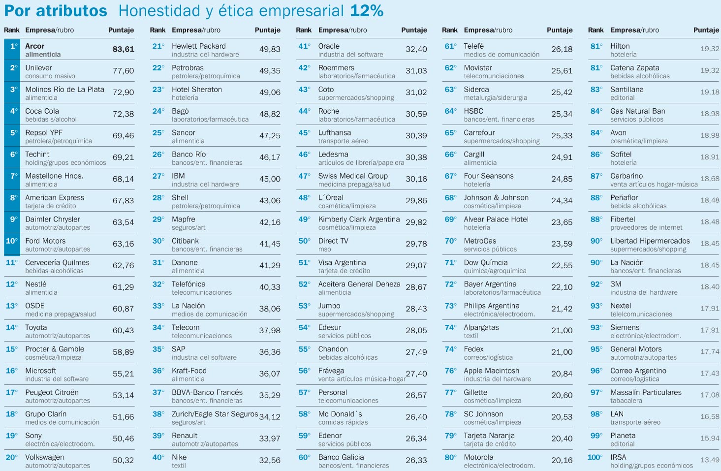 En el rubro «Honestidad y ética empresarial», por ejemplo, el grupo La Nación (editor del centenario matutino) aparece en el puesto 90º, 50 puestos más abajo que Nike, la empresa que siempre está sospechada de haber utilizado mano de obra infantil para confeccionar sus zapatillas (un escenario para nada inimaginable teniendo en cuenta la situación del mercado textil a nivel global).